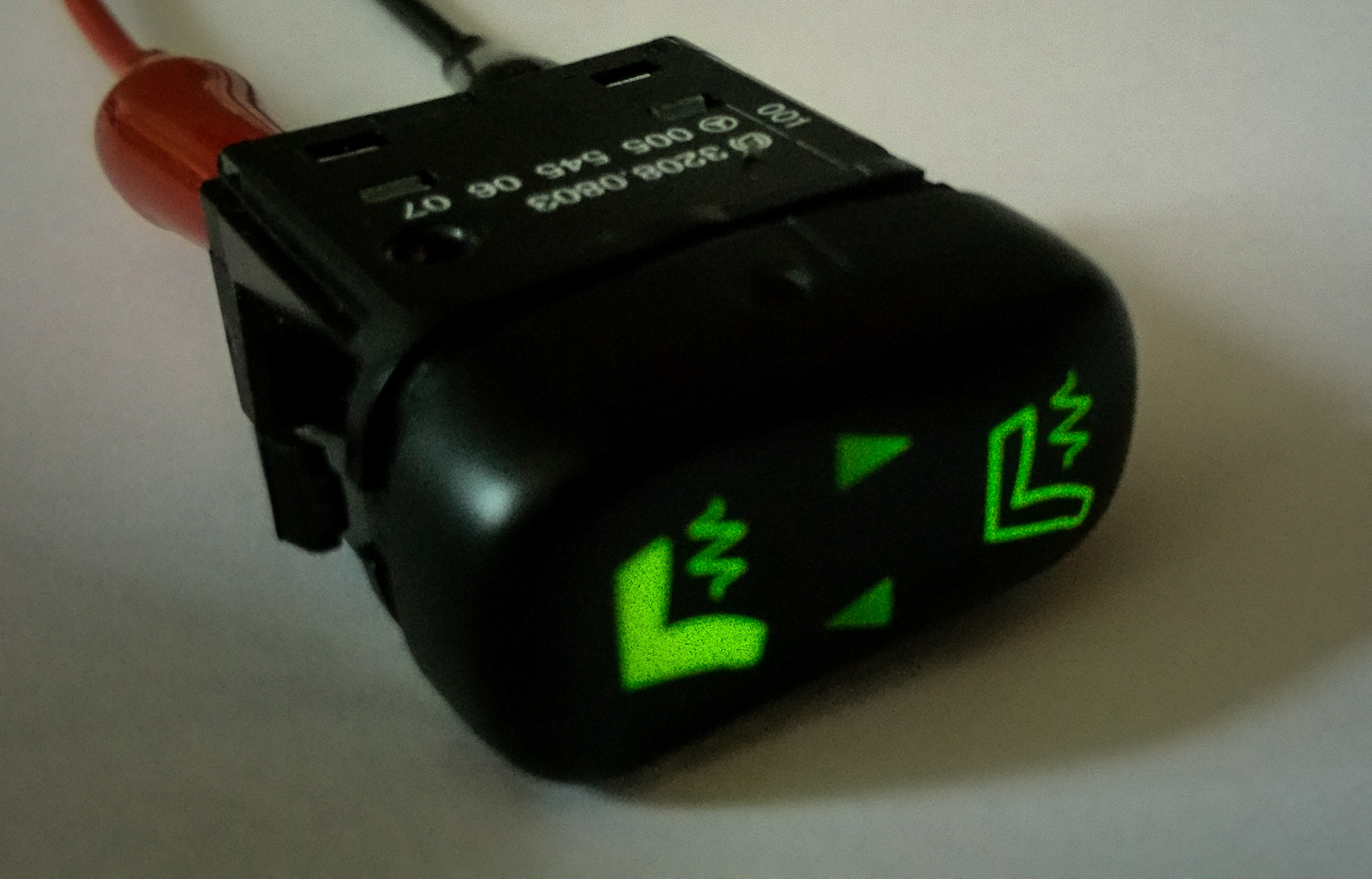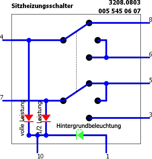Ich habe mir einen originalen Sitzheizungsschalter besorgt und durch Ausmessen die folgende Pinbelegung ermittet: