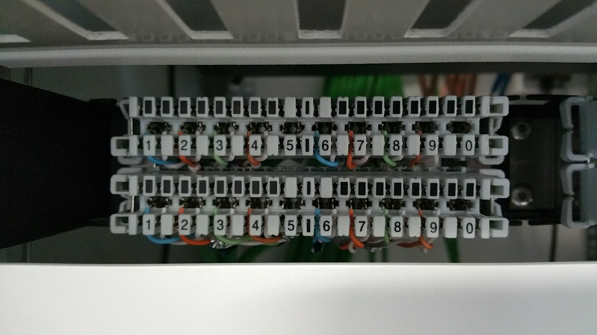 Die Verkabelung erfolgt mit handelsüblichen CAT-7A-Kabeln. Dies Kabel besitzen 4 verdrillte Aderpaare die folgendermaßen belegt werden: