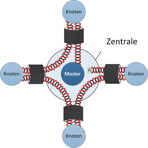 Rein logisch wäre eine Stern-Topologie die beste Variante. Alle Sensordaten laufen auf einen Punkt im Haus zusammen. Beim verwendeten CAN hingegen ist die Bus-Topologie streng vorgegeben. Alle Teilnehmer werden an einem Hauptstrang angeschlossen. Eine Leitung vom Hauptstrang zum Knoten darf nur wenige Meter betragen. Da mir dies nicht praktikabel erschien, habe ich mich dazu entschlossen physikalisch einen Stern zu erzeugen und diesen logisch als Bus anzulegen. Fällt nun ein beispielsweise ein Knoten aus, kann ich diesen einfach in der Zentrale abklemmen. Auch das Hinzufügen neuer Knoten ist weniger aufwändig. In der Praxis sieht der Bus nun folgendermaßen aus: