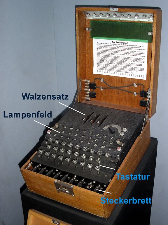 - Walzen (Zu jeder Enigma gab es einen Walzensatz aus bis zu 8 unterschiedlich verdrahteten Walzen aus denen 3 ausgewählt und in die Enigma eingesetzt werden konnten)
