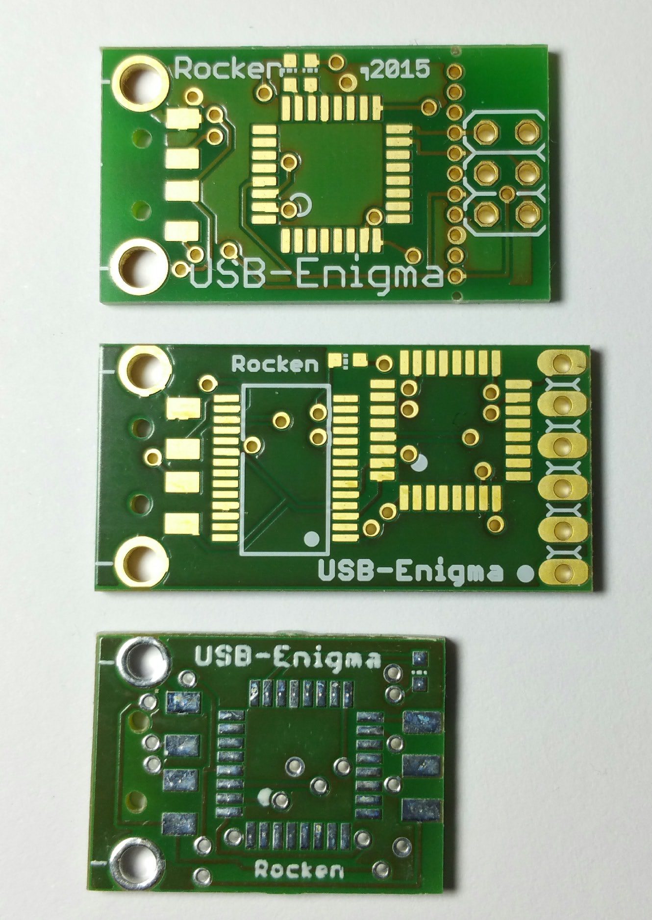 Die fertige USB-Enigma verwendet, wie auch bereits der Prototyp einen Atmega328P. Zur Entlastung des Mikrocontrollers wird nun die gesamte USB-Kommunikation von einem FT232RL erledigt. Dennoch konnte ich die Platine kleiner machen als beim Prototyp. Die USB Enigma ist nun in der aktuellen Version 3,5 x 1,5 cm groß; in eine USB-Buchse gesteckt, ragen noch 2,5 cm heraus, was in etwa heutigen USB-Sticks entspricht. Die geringe Abmessung wurde erreicht, indem ausschließlich SMD-Bauteile verwendet wurden. Für Widerstände und Kondensatoren wurde die SMD-Bauform 0603 (1,6 x 0,8 mm) gewählt. Diese lässt sich noch gut von Hand unter einem Mikroskop löten.