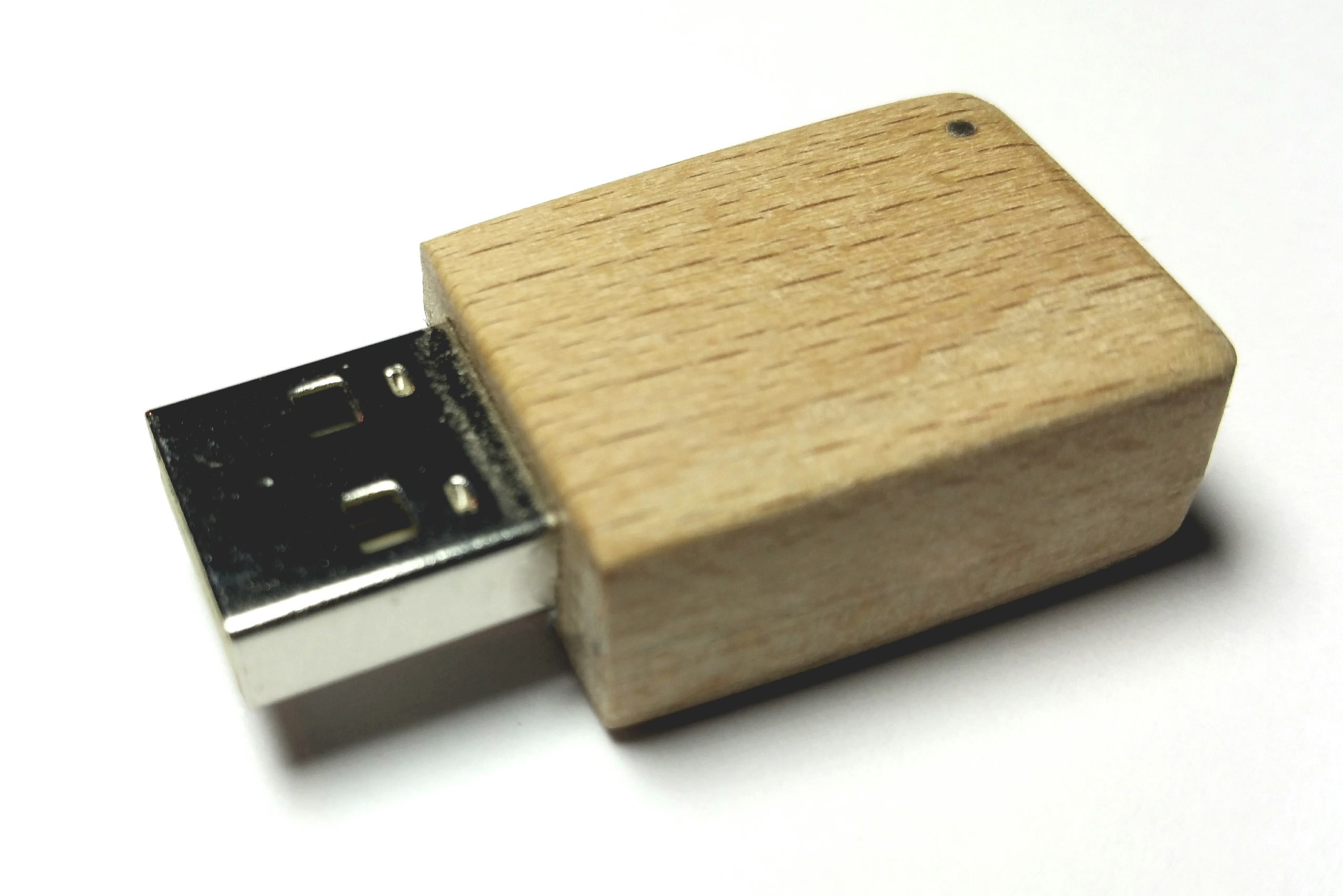 Um nicht die nackige Platine anfassen zu müssen, bekommt die USB-Enigma ein stilechtes Holzgehäuse. Die LED wird über eine Bohrung an der Oberseite in die ein kurzer Lichtleiter eingeklebt ist sichtbar bleiben.