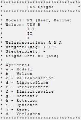 Ist das Board an den USB-Port angeschlossen, kann mit einem Terminal-Programm (z.B. HTerm) sofort losgelegt werden. Wird ein Buchstabe eingegeben wird dieser von der Enigma kodiert. Wird eine Ziffer eingegeben öffnet sich das Einstellmenü mit einem Überblick über die aktuelle Konfiguration und einer Auflistung aller Optionen. Wird ein Untermenü betreten, wird erneut ein Bildschirm mit den entsprechenden Optionen ausgegeben.