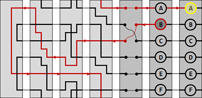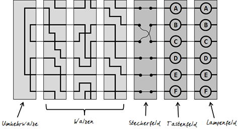 In der folgenden Grafik ist der Stromfluss gezeigt, der genommen wird, wenn der Buchstabe "B" eingegeben wird. Nachdem alle Walzen und das Steckerfeld durchlaufen wurden, leuchtet die Lampe A auf. Der Buchstabe "B" wird also zu "A" verschlüsselt. An dieser Stelle lässt sich gut erkennen, dass Bei Eingabe von "A" der Buchstabe "B" ausgegeben wird. Die Engima arbeitet also involutorisch: Ein Text wird mit der Enigma auf die gleiche Weise verschlüsselt wie er entschlüsselt wird.