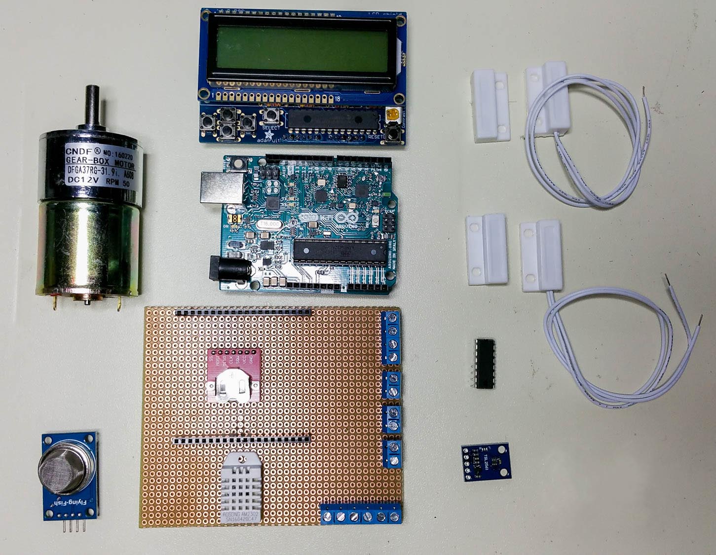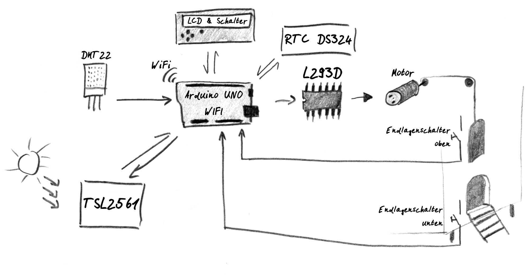 Als Basis habe ich einen Arduino UNO WiFi verwendet. Dieser steuert einen L293D an, der einen Motor mit integriertem Getriebe bewegt. An der Achse des Motors ist eine Schnur die Tür des Hühnerstalls verbunden. Wird der Motor aktiviert rollt er die Schnur auf und hebt die Tür. Der Steuerung erkennt über zwei Reed-Kontakte ob die Tür komplett hochgefahren oder geschlossen ist und schaltet den Motor automatisch ab.