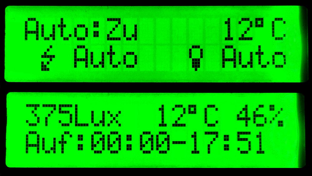 Zusätzlich zu diesen Grundfunktionen wird noch ein DHT22/AM2302 verbaut der die Temperatur und Luftfeuchtigkeit des Hühnerstalls misst. Abhängig von der Temperatur wird eine Infrarotlampe ein- und wieder ausgeschaltet.