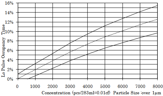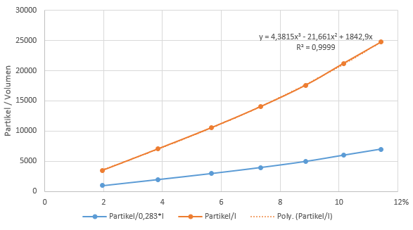 Mit dem WebPlotDigitizer kann man sich aus dem Graphen Messpunkte ermitteln. Diese habe ich in Excel wiederum als Diagramm anzeigen lassen und mit der Trendlinienfunktion eine kubische Gleichung herleiten lassen, die ziemlich gut den Kurvenverlauf wiederspiegelt. Die gewonnene Funktion wurde dann in der Software verwendet um die Messwerte von Prozent in Partikel / Liter umzurechnen.